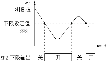 例如 SP2设定为下限报警,SP2=下限设定值,P2h=0,P2c=30,则SP2报警输出。