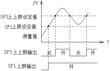 SP3设定为上上限报警,SP3=上上限设定值,P3h=0,P3c=31,SP1设定为上限报警,SP1=上限设定值,P1h=0,P1c=31,则SP3,SP1报警输出。