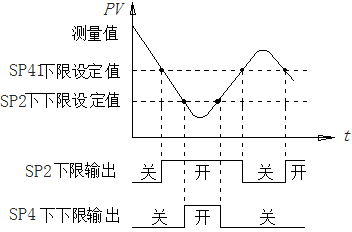 SP4设定位下下限报警,SP4=下下限设定值,P4h=0,P4c=30, SP2设定为下限报警,SP2=下限设定值,P2h=0,P2c=30,则SP4,SP2报警输出。