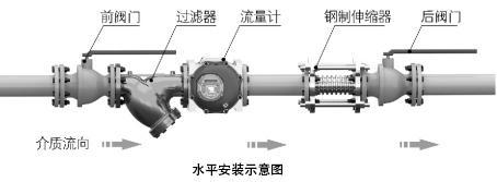 5、流量计水平安装时,建议在流量计后安装钢制伸缩器(补偿器),伸缩器必须符合管道设计的 公称通径和公称压力的要求。(伸缩器是作为管道应力的补偿及方便流量计的安装与拆卸)