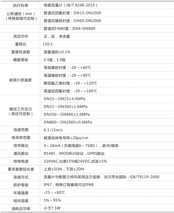 三、防腐型电磁流量计技术参数