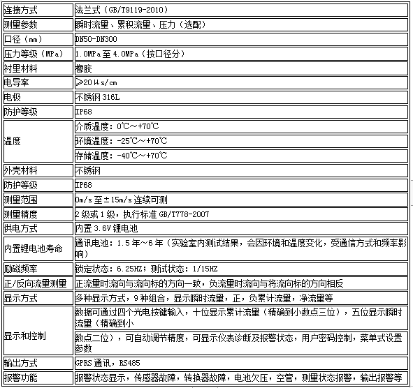三、GPRS远传电磁流量计技术参数