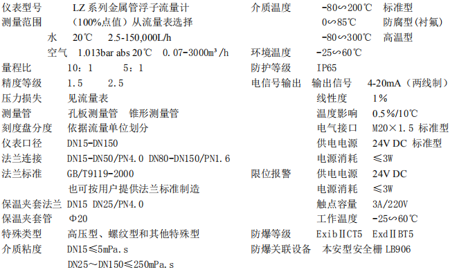 三、侧进测出型金属管浮子流量计技术参数