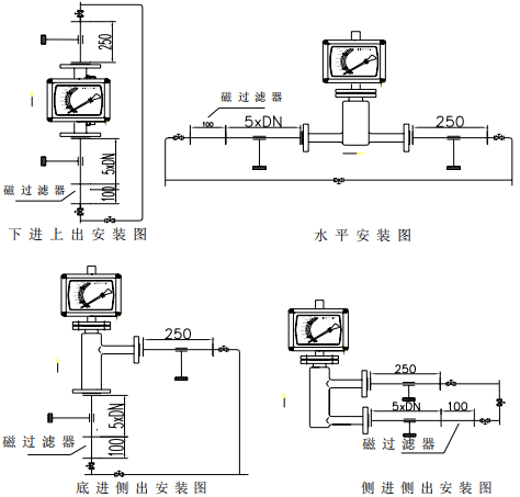 金属管浮子流量计的设计制作还考虑了用户工艺流向要求,有下进上出安装型、上进下出安装型、侧进侧出安装型、底进侧出安装型、水平安装型等安装方式可选。