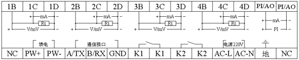 (2)变送输出:最多支持2路通道的4-20mA标准电流变送输出,负载能力750Ω(最大),方便了显示仪表或DCS/PLC的采集,实现了信号的长距离传输