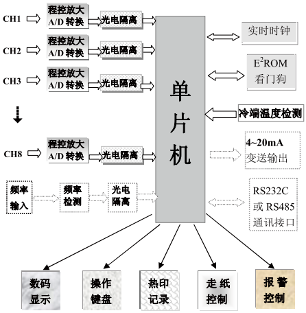 每路输入信号经程控放大,24位分辨率A/D转换,光电隔离送至单片机处理。从而彻底消除了各输入通道之间的干扰,消除了输入通道与CPU之间的干扰。使用高精度数字温度传感器,进行热电偶的冷端温度补偿。为了提高长期稳定性,本记录仪放弃了传统的用电位器调整放大倍数及零点的方法,代之以软件程序调校法,并实现了放大倍数的程控放大。出厂前厂方对各项参数均已调试完成。用户可通过键盘设定对系统误差进行平移校正。