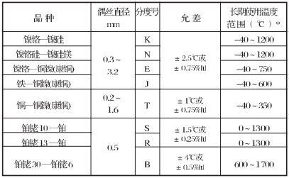 三、装配热电偶主要技术参数