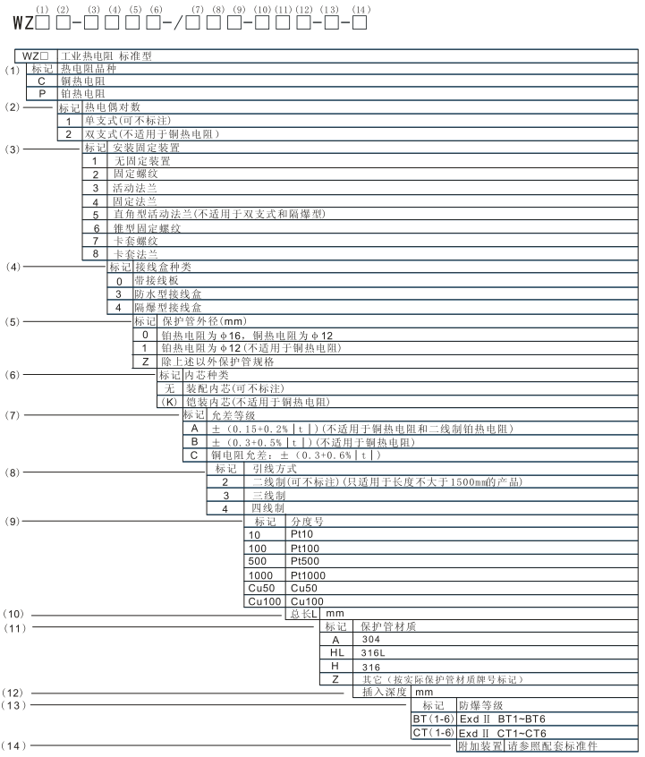 隔爆型热电阻通过特殊结构的接线盒,把其外壳内部爆炸性混合气体因受到火花或电弧等影响而发生的爆炸局限在接线盒内,生产现场不会引超爆炸。隔爆型热电阻可用于Bla--B3c级区内具有爆炸危险场所的温度测量。