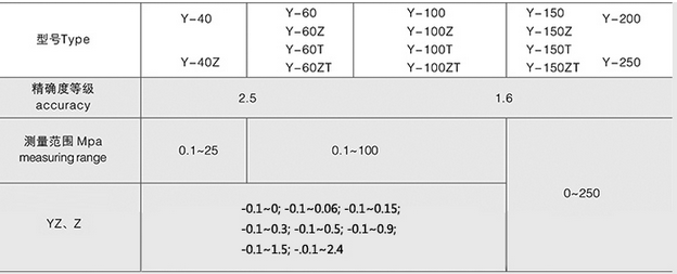 3、测量范围(Mpa): 0~0.1、0~0.16、0~0.25、0~0.4、0~0.6、0~1、0~1.6、0~2.5、0~4、0~6、0~10、0~16、0~25、 0~40、0~60、0~100;-0.1~0、-0.1~0.06、-0.1~0.15、-0.1~0.3、-0.1~0.5、-0.1~0.9、 -0.1~1.5、-0.1~2.4