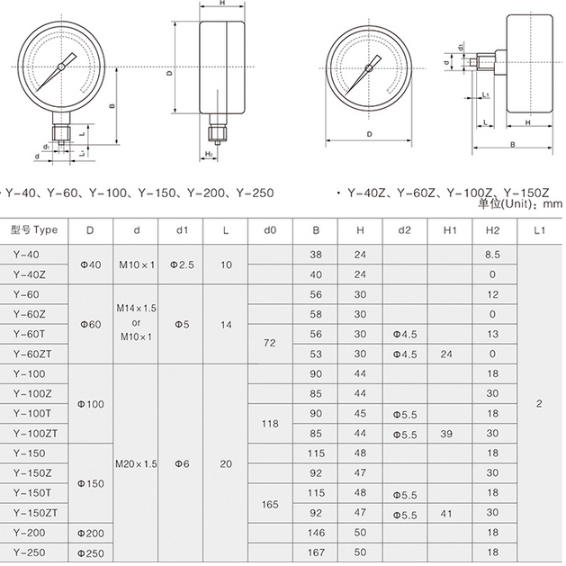 1、表盘直径(mm):φ40;φ50;φ60;φ100;φ150;φ200;φ250