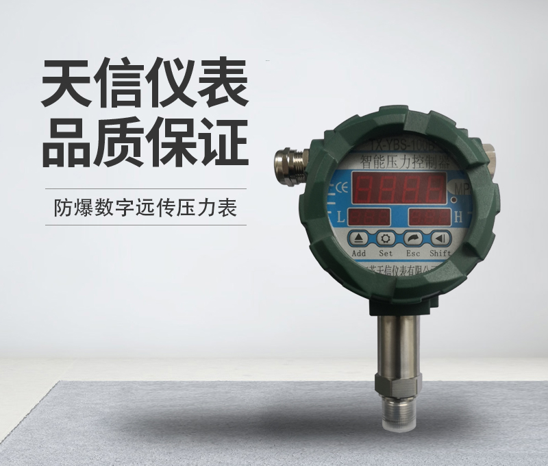 防爆数字远传压力表为现场实时显示压力值且带电流输出的精密压力仪表;高性能电路,采用进口压力传感器芯片和进口电子器件,具有抗干扰,高性能,操作简单等特点。主要应用于石油、化工、航空及各种工业气体液体的控制及测量。