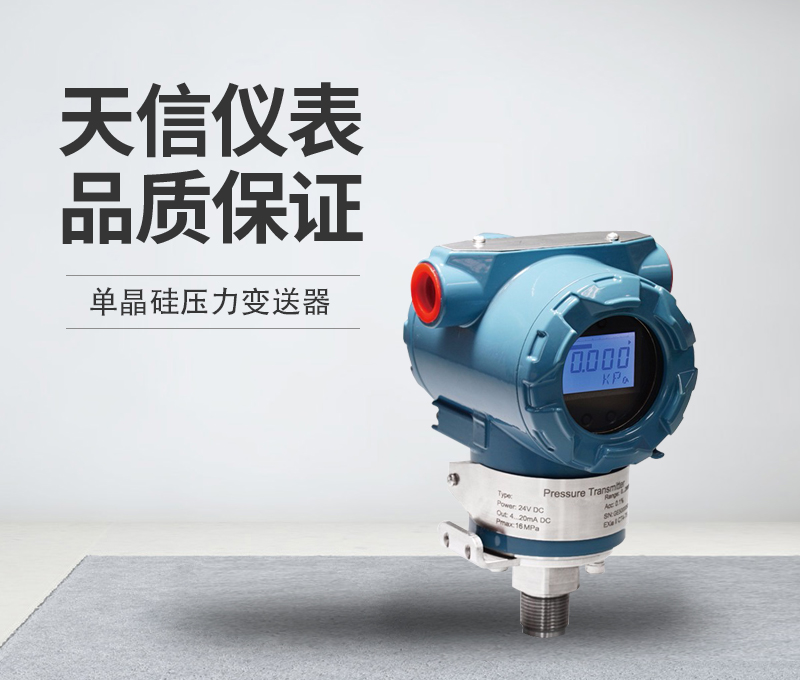 单晶硅压力变送器内部芯片采用进口单晶硅压力芯片,传感器信号经过专用信号处理模块转换成标准信号输出,经过长期老化及稳定性筛选,产品性能稳定可靠,应用于环境比较恶劣的露天现场,同时能够现场压力显示,零点,满程可迁移。