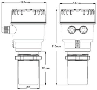 开敞环境下一般采用支架安装方式,用仪表自带螺圈固定。或直接在罐顶或盖子顶部安装位置上开一个直径60mm的圆孔,将仪表放入,然后将螺圈自下而上旋紧。安装必须保证仪表的探头面与被测液面水平。仪表的探头发波打到液位后反射回探头,探头接收到后计算发波到收波的时间,得到测量空距H,仪表安装高度TH减去测量空距H将得到当前液位L。仪表量程指仪表能够测量的距离,安装高度 TH 应小于量程。仪表盲区指仪表在探头附近无法测量的区域,最高液位与探头间距应大于盲区,例盲区为0.5m,则最高液位与探头间距必须大于0.5m。如:量程:6m,盲区:0.45 米,实际测量最高液位为:0~5.55m。探头发波是个扩散过程,即有方向角,安装时要注意,否则可能打到池壁的凸起物或渠道边沿。